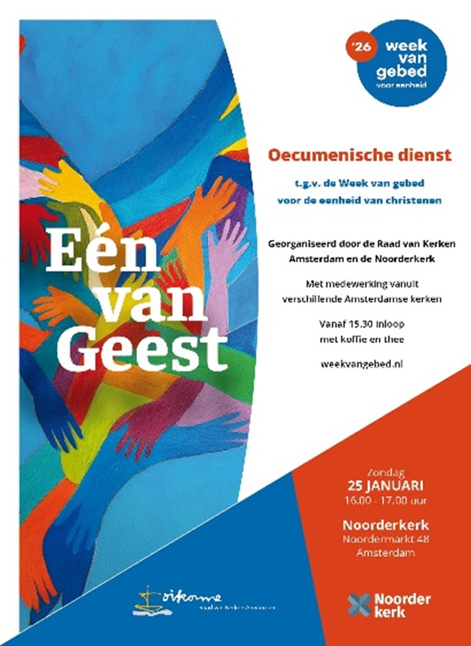 De Raad van Kerken Amsterdam viert dit jaar de Week van Gebed voor de eenheid van christenen met een oecumenische middagdienst samen met de Noorderkerk; voorgangers uit verschillende lidkerken zullen hun medewerking verlenen. U bent van harte welkom!